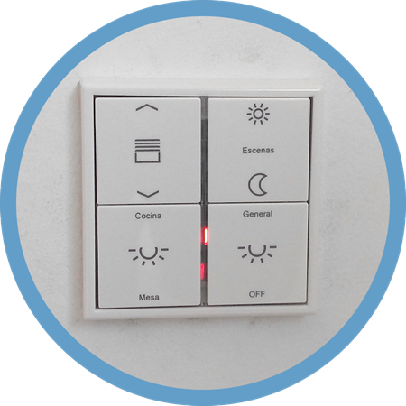 - La casa cuenta con pulsadores multifunción para la activación de luces, escenas ambientales, etc… Y, para que su uso fuera lo más sencillo posible, se diseñaron con una serigrafía totalmente personalizada en función de las necesidades y gustos de los dueños de la casa.