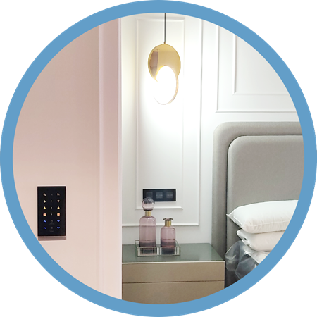 - La casa cuenta con muchas luces regulables en intensidad, persianas, estores… Pero, para disfrutar del ambiente perfecto, los dueños de la casa no tienen que modificar la intensidad de cada una de las luces una por una, ni subir y bajar cada uno de los estores o persianas por separado; sólo tienen que clicar en la escena ambiental que quieran disfrutar en ese momento. Escena cine o relax en el salón, escena buenos días o buenas noches en la habitación… Sólo con un toque en el dibujo correspondiente del pulsador multifunción que hay en la pared, con un clic en el móvil o sólo con pedírselo en voz alta a Alexa…