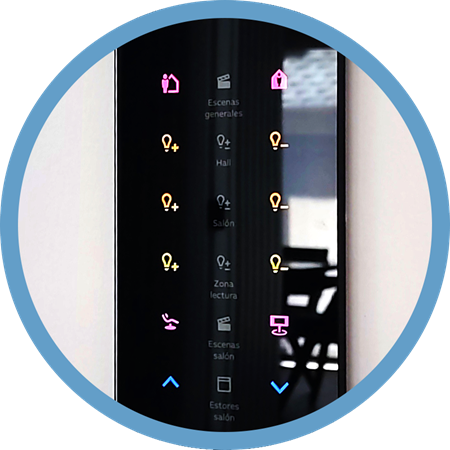 - Todos los pulsadores multifunción que hay en la casa son muy fáciles de utilizar gracias la serigrafía personalizada de cada uno de ellos. Ya sea para activar escenas ambientales, cambiar la intensidad de una luz, abrir una persiana o incluso cerrar una ventana, sólo hay que tocar sobre el dibujo correspondiente.Y no sólo eso, estos pulsadores multifunción de cristal cuentan con control gestual. Así, al salir de cada habitación, sólo es necesario acercar la palma de la mano al pulsador y, automáticamente, se apagarán todas las luces y cerrarán las ventanas.